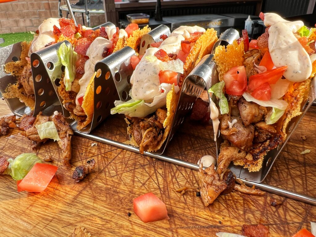Thinly sliced steak hits the hot griddle for that perfect sear, locking in juicy flavor while onions and peppers caramelize alongside it. Everything gets chopped and piled high, then topped with melty cheese that blankets every bite. Served on a steamed hoagie roll, this cheesesteak delivers that classic, no-frills, big-city taste—with the added bonus of that irresistible griddle crisp you can only get on a Blackstone.